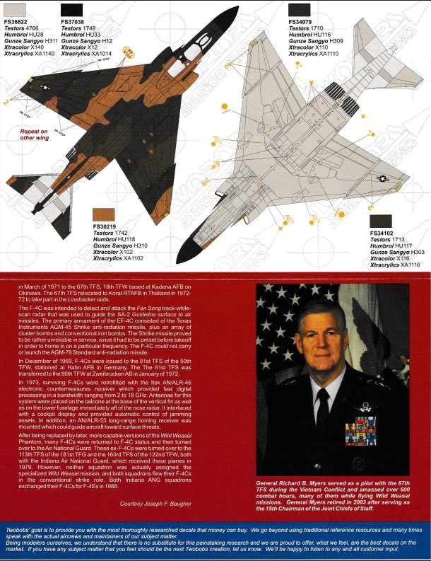 jacmin Napisano 3 Lutego Autor Share Napisano 3 Lutego Wracając do modelu. Po wielu dyskusjach z Pułkownikiem - chciałem pokazać jak najwięcej "anatomii" maszyny, ale bałem się że przesadzę i nie będzie to realnie wyglądało- ustaliliśmy, że optymalnym kompromisem będzie następujący schemat: Samolot stoi na płycie lotniska pomiędzy 2 osłonami przeciwodłamkowymi. Dookoła krzątają się mechanicy, przygotowując maszynę do lotu. Owiewki obu kabin orwarte, drabinki zawieszone. Otwarta pokrywa luku działka, wysunięte klapy (czasem były tak zostawiane) podwieszone zbiorniki podkadłubowy, oba podskrzydłowe oraz 2x AGM45 Shrike ( w takiej właśnie konfiguracji leciał na Son Tay). Przy osłonach przeciwodłamkowych na stelażach 2 dodatkowe zbiorniki. Pewnie pojawi się też podest C1 przy działku oraz trochę innego sprzętu używanego podczas rozruchu maszyny. Dość długo ustalaliśmy kolorystykę i ogólny wygląd, bo zachowały się jedynie 2 zdjęcia maszyny i to z 1968r, czyli przed rajdem. Nosiła wtedy nazwę "Fat Fanny" i miała namalowaną z lewej strony podobiznę rzeczonej Fanny (jaś firma wypuściła nawet kalkomanie do tego malowanie ale w 1/48): Na zdjęciu powyżej strzałka wskazuje miejsce, gdzie w wersji G znajduje się wybrzuszenie z zasobnikiem z elektroniką. Ten egzemplarz go nie posiadał stąd wiadomo, że to wersja F. Tak wyglądał ten samolot gdy stacjonował na Okinawie. Generalnie tradycja wyglądała w ten sposób, że gdy pilot dostawał przydział do maszyny, mechanicy malowali jego i EWO nazwiska z lewej strony na owiewkach (prawa strona była pusta lub miała jedynie namalowane tło do napisów) oraz tzw nose art, czyli grafikę z jakąś nazwą. Tak jak wcześniej pisałem, podczas rajdu samolot ten był wypożyczony z bazy Kadena na Okinawie, ale do Korat w Tajlandii trafił przemalowany, bez nazwisk pilotów oraz z zamalowaną "Fanny" . Posiadał klasyczny schemat malowania SEA, wnęki podwozia oraz przedziały elektroniki i działka w zielonym podkładzie Green zinc chromatic. Golenie i felgi srebrne. Wnętzre kabiny szare jak w większości amerykańskich maszyn z tego okresu. 3 Cytuj Odnośnik do komentarza Udostępnij na innych stronach More sharing options...