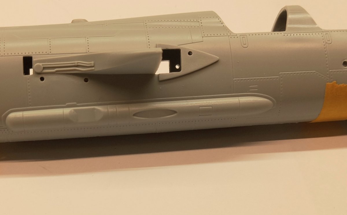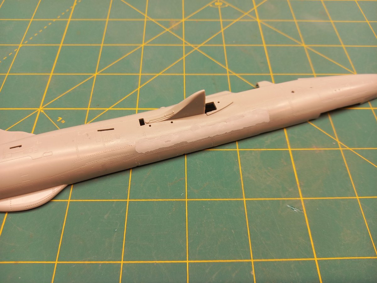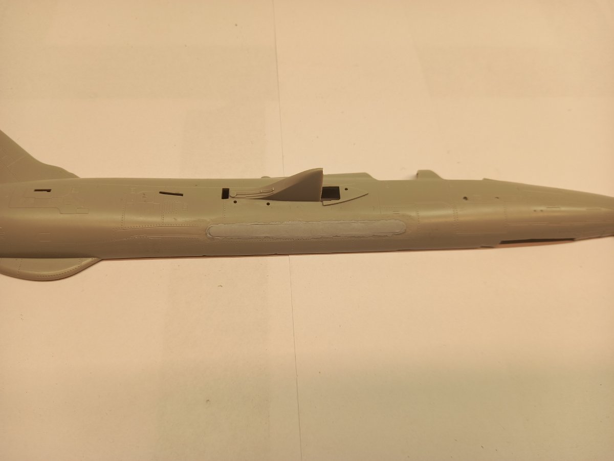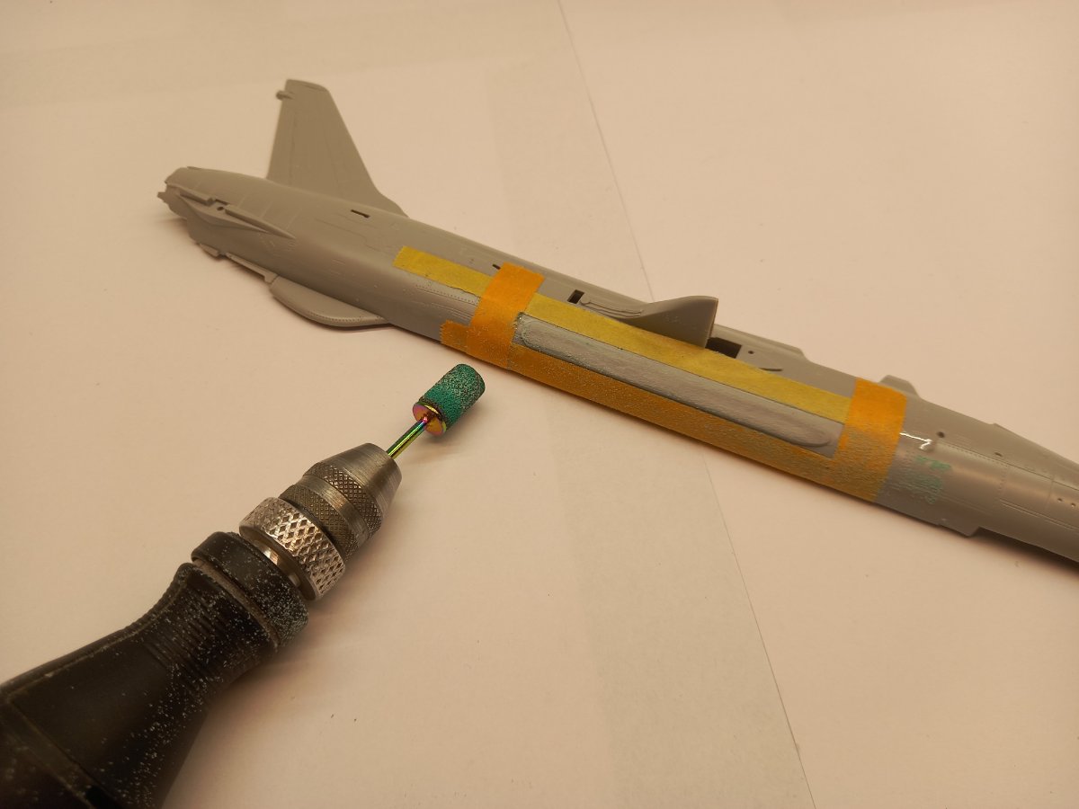 jacmin Napisano 3 Lutego Autor Share Napisano 3 Lutego A teraz do dzieła! Tradycyjnie wyciąłem i oczyściłem wszystkie elementy. Część z nich jak fotele, koła, czy dysza trafiły na modelarski szrot, bo zostaną zastąpione dodatkami. Kolejne zadanie do pozbycie się zasobników charakterystycznych dla wersji G: Przestrzeń dookoła zabezpieczyłem twardą, przezroczystą taśmą, od której zwykle ryję linie podziałowe a na nią żółtą taśmę modelarską żeby lepiej widzieć swoje "pole operacyjne". Następnie papier ścierny na rolkę i szlifowanie: Po tej operacji powstała śliczna, podłużna dziura, którą trzeba zaślepić. Dociąłem pasek polistyrenu i lekko go wygiąłem, żeby dopasować do krzywizny kadłuba. Od zewnątrz w szczelinę wklejałem paski polistyrenu aż do uzyskania wypełnienia. Potem oczywiście kilka razy szpachla. W sobotę będę to wszystko docierał i ponownie szpachlował. Jak starczy czasu to zajmę się działkiem i jego komorą. 6 Cytuj Odnośnik do komentarza Udostępnij na innych stronach More sharing options...