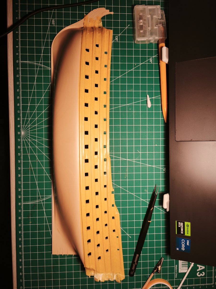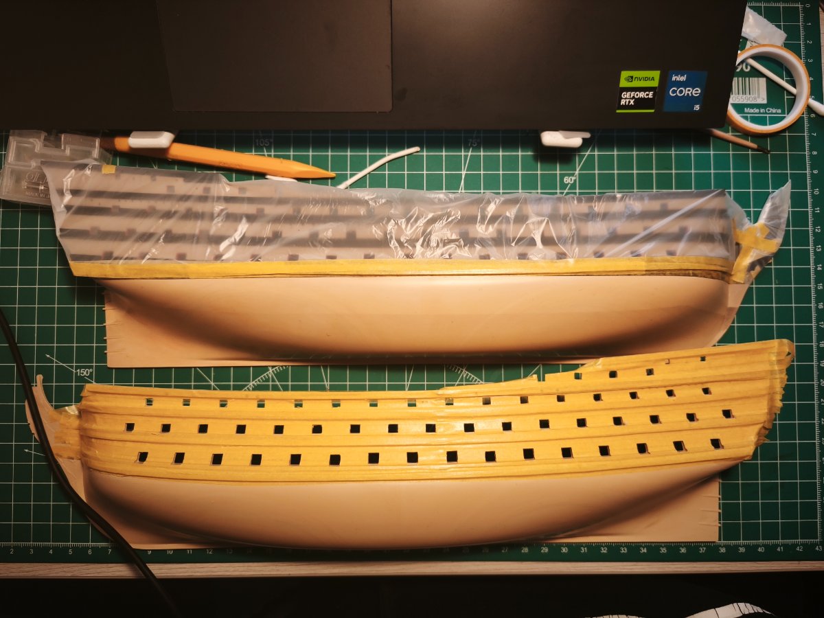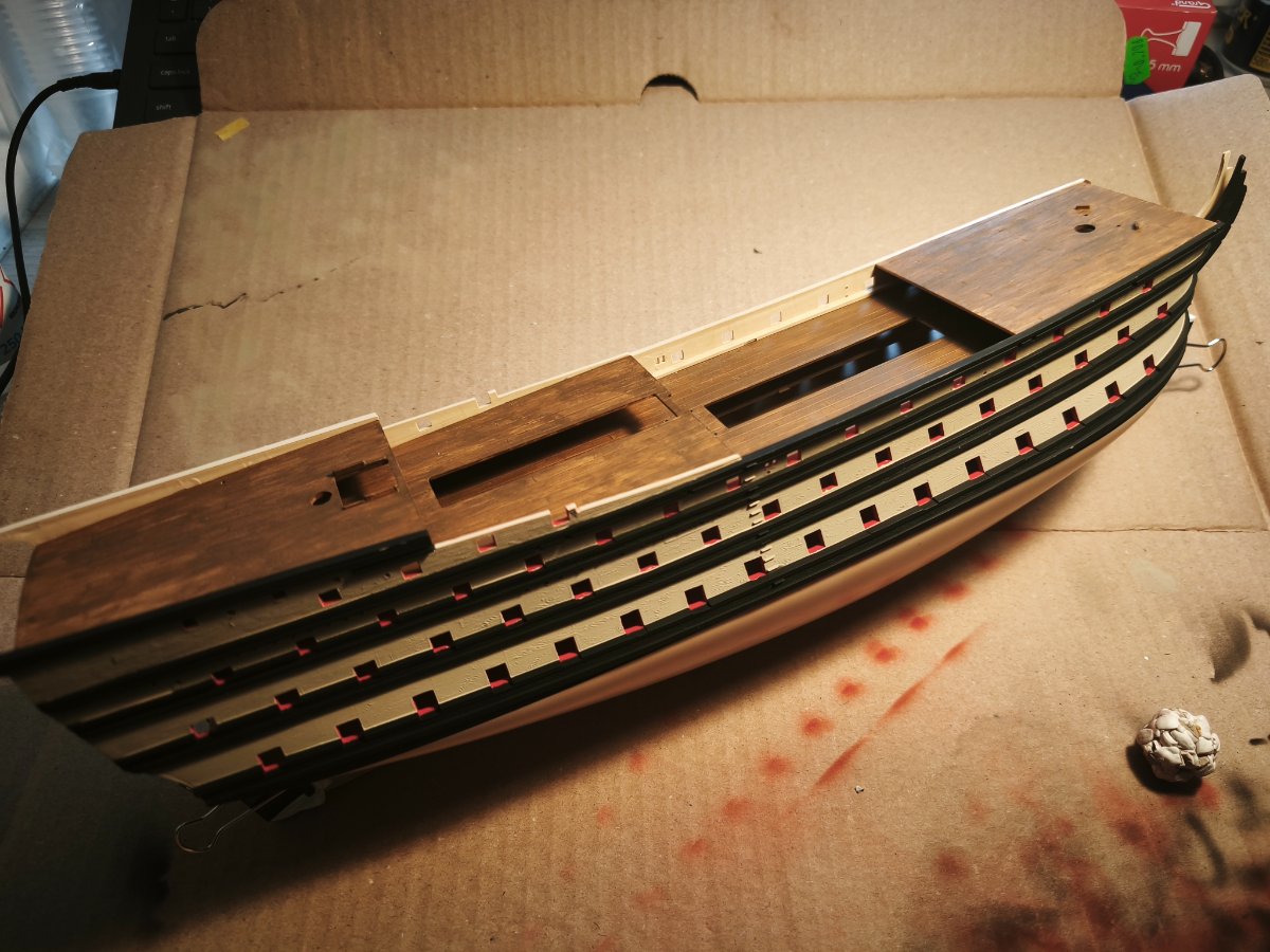 Kretes Napisano 4 godziny temu Share Napisano 4 godziny temu (edytowane) Witam, post podzielę na kilka tematów między którymi postaram się płynnie przechodzić, - historię okrętu - moje doświadczenie - start relacji Kilka tygodni temu w moje ręce wpadł model okrętu liniowego Royal Louis firmy Heller. Model Hellera bazuje na okręcie projektu Blaise Ollivier. Zbudowany w czasach wojen sukcesyjnych, był bardzo nowoczesną i potężną jednostką. Miał być okrętem flagowym floty śródziemnomorskiej, pokazem potęgi technicznej Francji. Był odpowiedzią na brytyjskiej "100-gun ships" Niestety pomimo, że okres jego służby przypadał na wojnę o sukcesję austryjacką i początek rywalizacji kolonialnych z Wielką Brytanią to tak jak jego poprzednicy pełnił głównie funkcje flagowe I szkoleniowe - głównie z powodu bardzo wysokiego kosztu utrzymania i obawy przed utratą okrętu-symbolu. Francja po śmierci Ludwika XIV (1715) ograniczała wydatki na flotę, stawiając na jakość i prestiż, a nie masową produkcję. Utrzymywała tylko kilka okrętów-symboli. Przy czym Royal Louis był traktowany niczym "pływający tron". mający reprezentować monarchię. Charakterystycznym była wysoka jakość wykonania i bogate zdobienia rufy. Nazwa Royal Louis była najbardziej prestiżową nazwa w Marine Royale. Zawsze była rezerwowana dla okrętów I rangi, na przestrzeni XVII i XVIII wieku nosiło kilka jednostek. Ostatecznie został rozebrany w latach 60 XVIII w. w Tulonie, po uznaniu go za okręt doktrynalnie przestarzały, drogi i mało użyteczny operacyjnie. Okręt zbudowano w Tulonie, stępkę połozono około 1738 r. okręt został zwodowany w 1743 r. a wszedł do słuzby rok później. Wymiary (orientacyjne) - długość: 60 m - szerokosć: 16 m - wypornosć: 2500-2700 ton Załoga około 950-1100 ludzi w tym - marynarze - artylerzyści - oficerowie - piechota morska Uzbrojenie - 110-112 dział - dolny pokład: 30 x 36-funtowe działa - środkowy pokład: 32 x 24-funtowe działa - górny pokład: 32 x 12-funtowe działa - kasztel dziobowy i rufowy: 16-18 dział 6-funtowych Dobra wstęp już mamy, teraz do konkretów. Przygodę z modelarstwem jakąś tam mam, złozyłem w swoim życiu kilka modeli, przeważnie były to pojazdy wojskowe (SdKfz 182 Königs Tiger, SdKfz 222) oraz żaglowiec HMS Victory. Jedynie HMS Victory doczekała się malowania, niestety malowanie pędzlem nie satysfakcjonowało mnie i postanowiłem, że do Royal Louis zabiorę się po zakupie aerografu. Jeżeli ktoś zauważy coś niepokojącego w mojej technice, albo chciał by podzielić się wiedzą, będę wdzięczny. Budowę zacząłem od kadłuba (działa i lawety mają spore nadlewy), żeby nie zgłupieć postanowiłem ruszyć z kadłubem i pokładami. Wstęp to przygotowanie obu kadłubów pod malowanie wnętrza okrętu i konturów luków działowych. Dopiero po pomalowaniu pokładu doszedłem do wniosku, że zasadniczo malowanie mogłem zaczać od naniesienia białej farby na wodnicę w pierwszej kolejności, a dopiero na kolejnych etapach nanosić pozostałe kolory (bład nowicjusza). Wyszły też drobne niedociągnięcia i zadrapanie czarnej farby, ale to już delikatnie zretuszuję pędzelkiem. W związku z powyższym musiałem zaimprowizować. Oba pokłady idą dziś do malowania na biało. Pokład oklejony taśmą maskującą jest jeszcze nietknięty, po naniesieniu białej farby, zabezpieczę go i przyjmę kolejność z pokładu wyżej - wnętrze i luki - jasny brąz - czerń Edytowane 4 godziny temu przez Kretes 1 Cytuj Odnośnik do komentarza Udostępnij na innych stronach More sharing options...