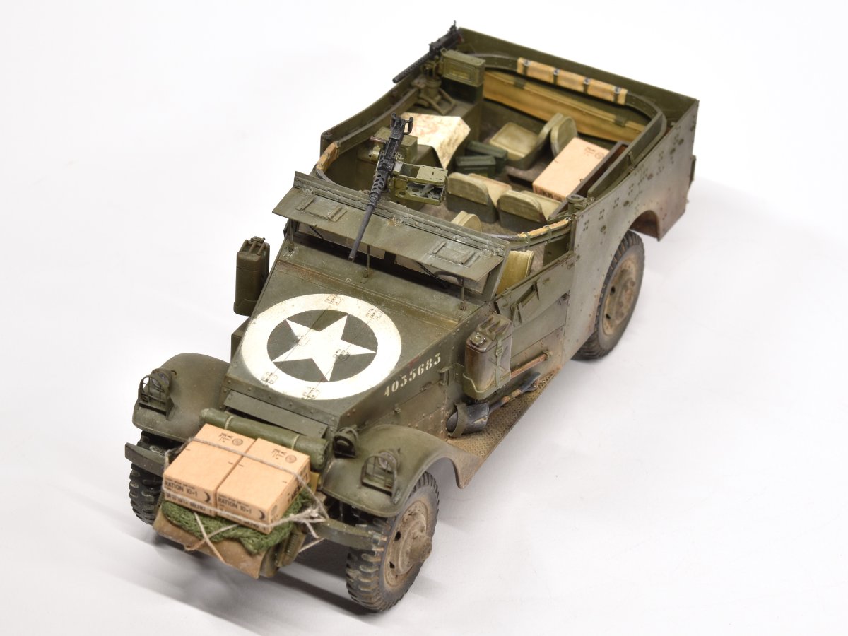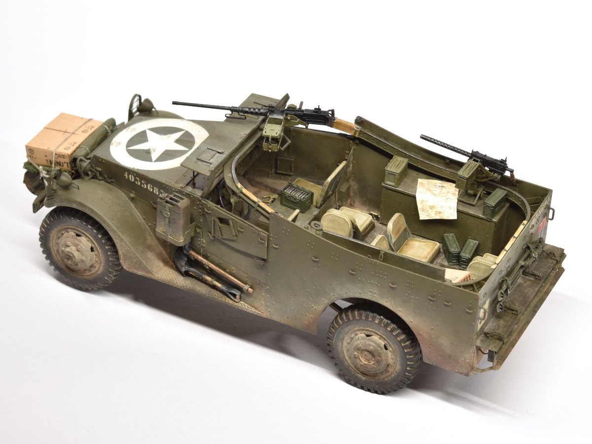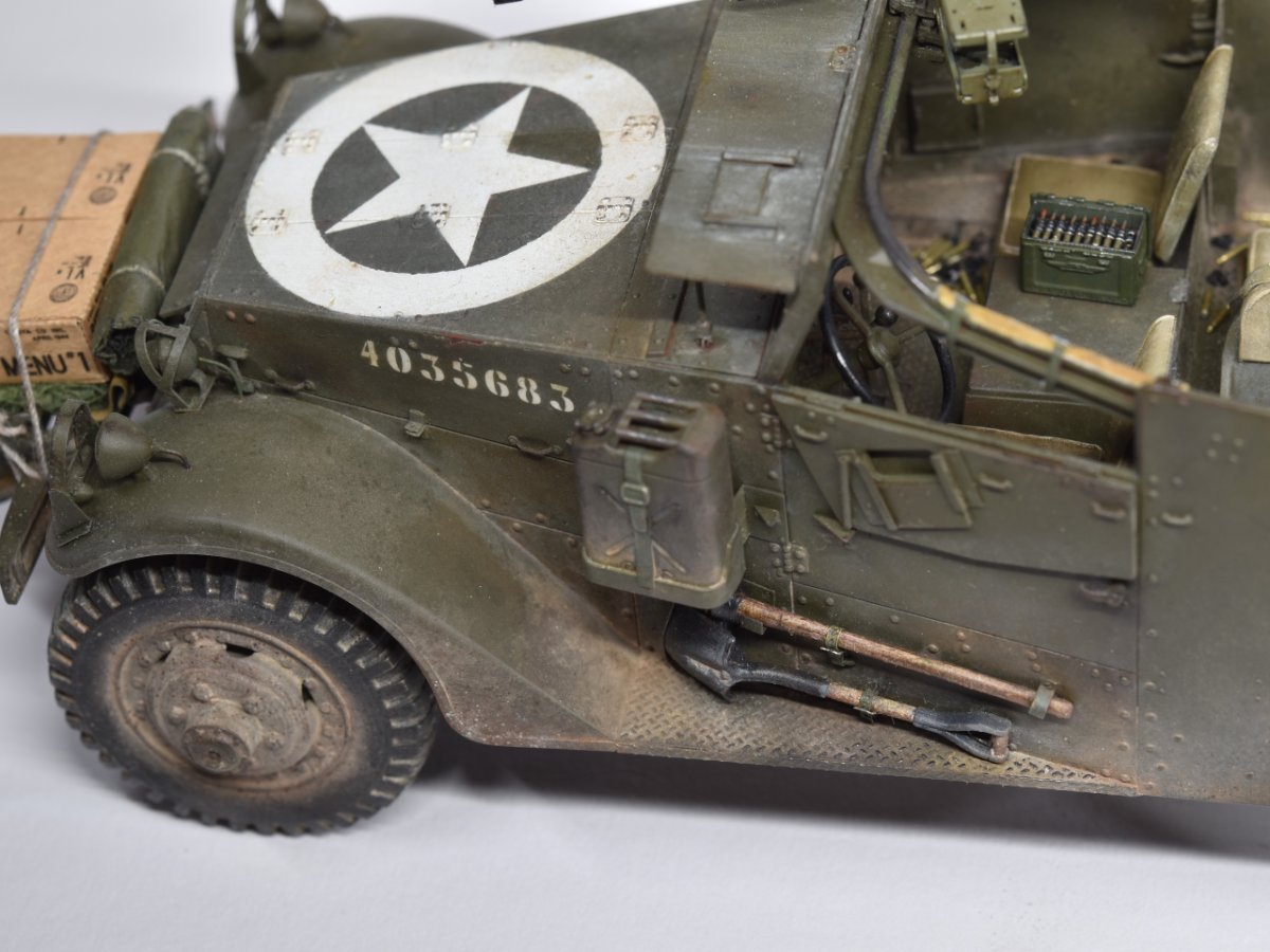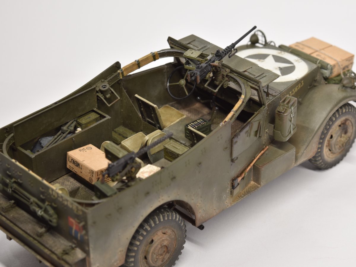 Patafian Napisano 4 godziny temu Share Napisano 4 godziny temu Jako, że musiałem odpocząć od Panthery, zrobiłem "mały skok w bok" Przedstawiam M3A1 Scout Car z Tamiya. Model w zamyśle miał być relaksacyjny i w sumie taki był. Bardzo przyjemny w budowie, ale wymagał trochę ulepszeń aby uatrakcyjnić końcowy wygląd. Do modelu wykorzystałem - Blachy Voyager PE351131 - Browning M1919 A4 MASTER - Browning M2HB. 50 cal MASTER - trójnóg do .50 cal MASTER - skrzynki amunicyjne M2 otwarte MASTER - skrzynki amunicyjne M2 zamknięte LEGEND - skrzynki amunicyjne M1 zamknięte MASTER - łuski i łączniki pasa amunicyjnego MASTER - Kartony z racjami żywnościowymi Tamiya - Mapa - PLUSMODEL - parę elementów wykonanych samodzielnie (klamry, kable do lamp) uff chyba wszystko Dodatki oczywiście znacznie wydłużyły pracę, ale i tak poszło to sprawnie. Zapraszam do komentowania. 6 Cytuj Odnośnik do komentarza Udostępnij na innych stronach More sharing options...