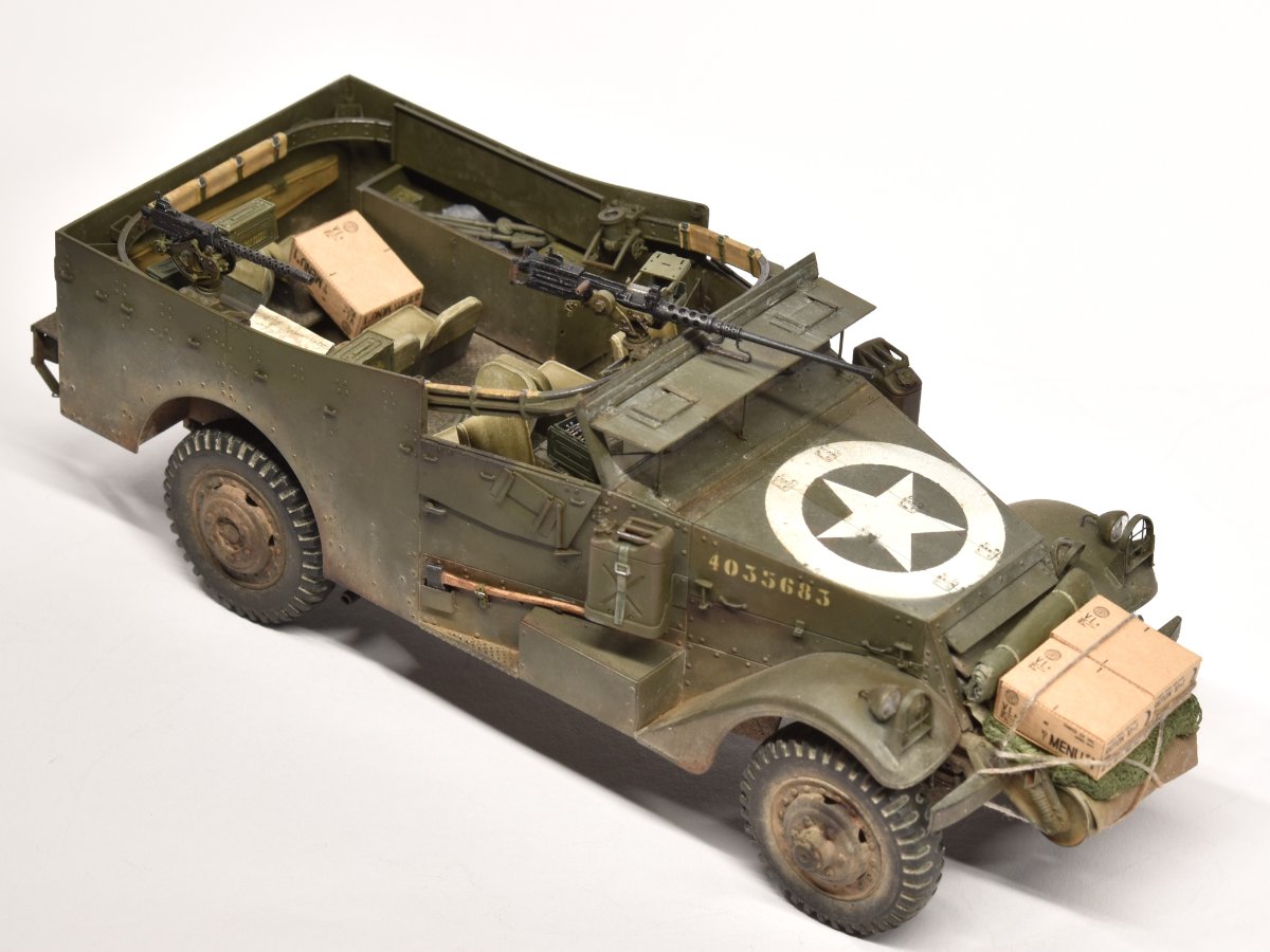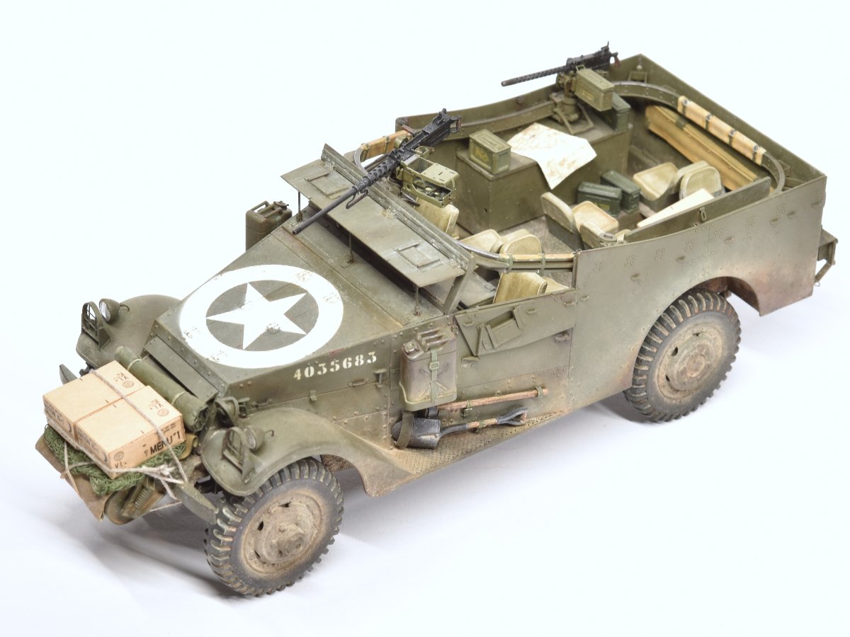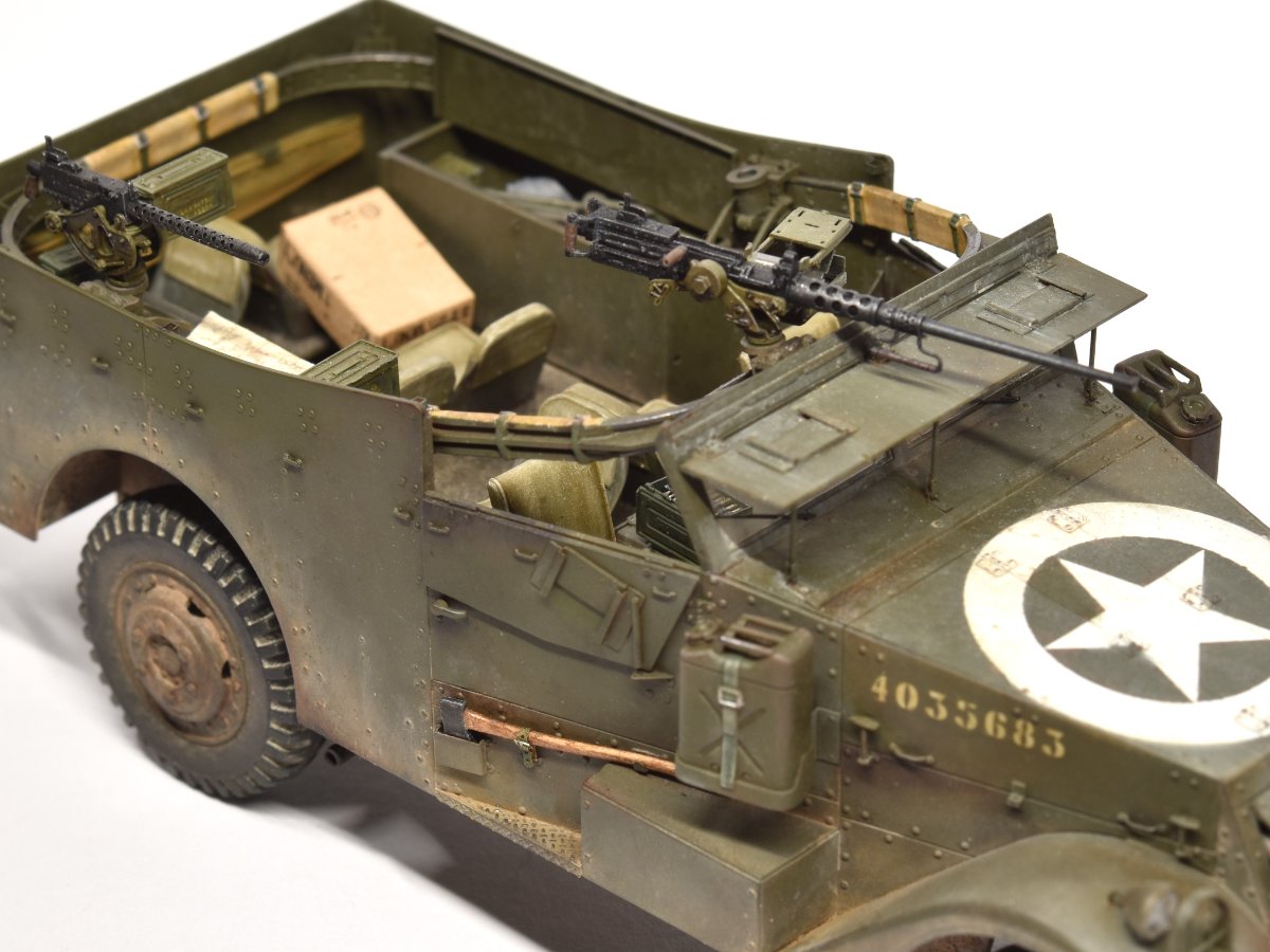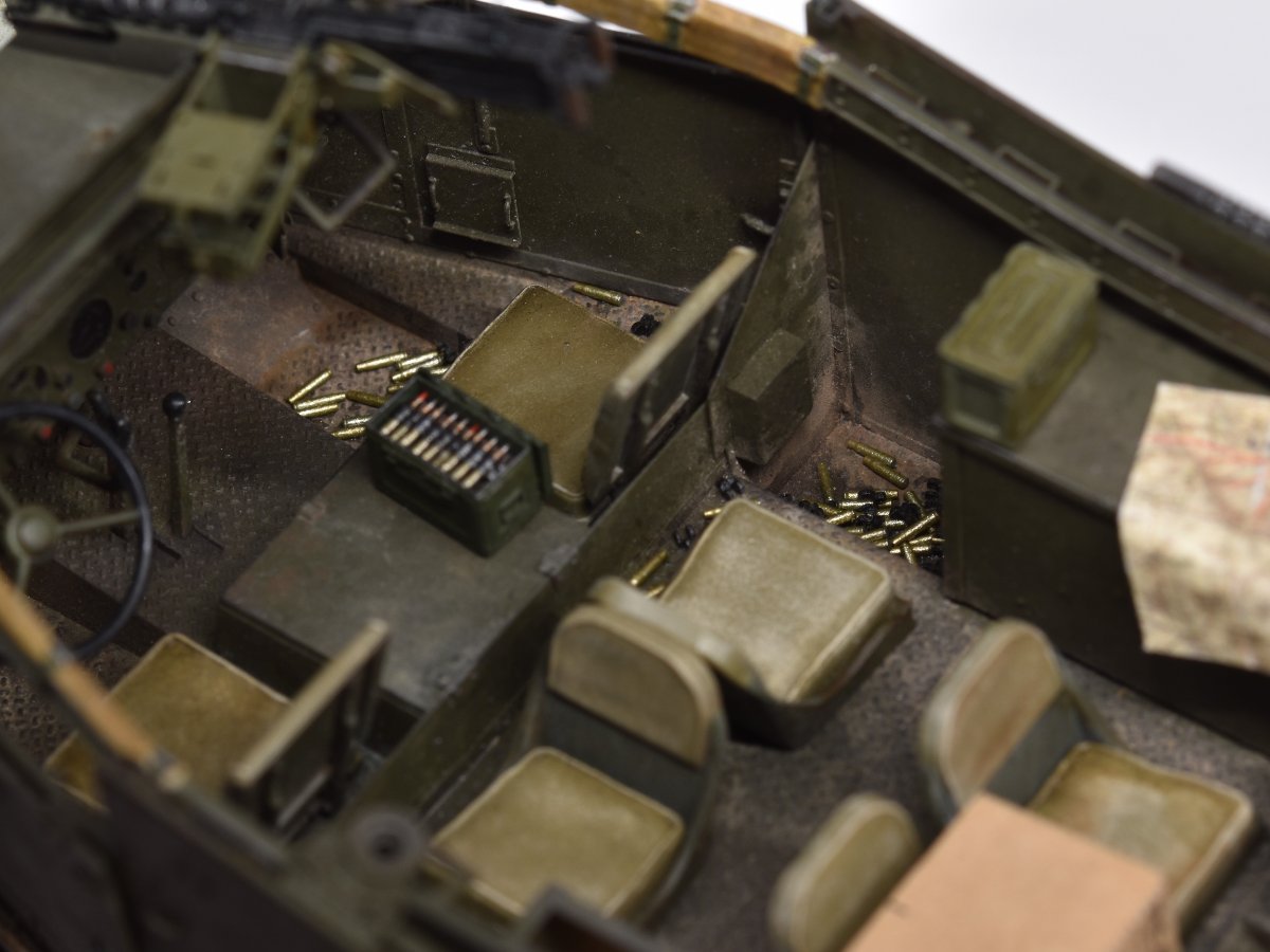 Patafian Napisano 4 godziny temu Share Napisano 4 godziny temu Jako, że musiałem odpocząć od Panthery, zrobiłem "mały skok w bok" Przedstawiam M3A1 Scout Car z Tamiya. Model w zamyśle miał być relaksacyjny i w sumie taki był. Bardzo przyjemny w budowie, ale wymagał trochę ulepszeń aby uatrakcyjnić końcowy wygląd. Do modelu wykorzystałem - Blachy Voyager PE351131 - Browning M1919 A4 MASTER - Browning M2HB. 50 cal MASTER - trójnóg do .50 cal MASTER - skrzynki amunicyjne M2 otwarte MASTER - skrzynki amunicyjne M2 zamknięte LEGEND - skrzynki amunicyjne M1 zamknięte MASTER - łuski i łączniki pasa amunicyjnego MASTER - Kartony z racjami żywnościowymi Tamiya - Mapa - PLUSMODEL - parę elementów wykonanych samodzielnie (klamry, kable do lamp) uff chyba wszystko Dodatki oczywiście znacznie wydłużyły pracę, ale i tak poszło to sprawnie. Zapraszam do komentowania. 6 Cytuj Odnośnik do komentarza Udostępnij na innych stronach More sharing options...