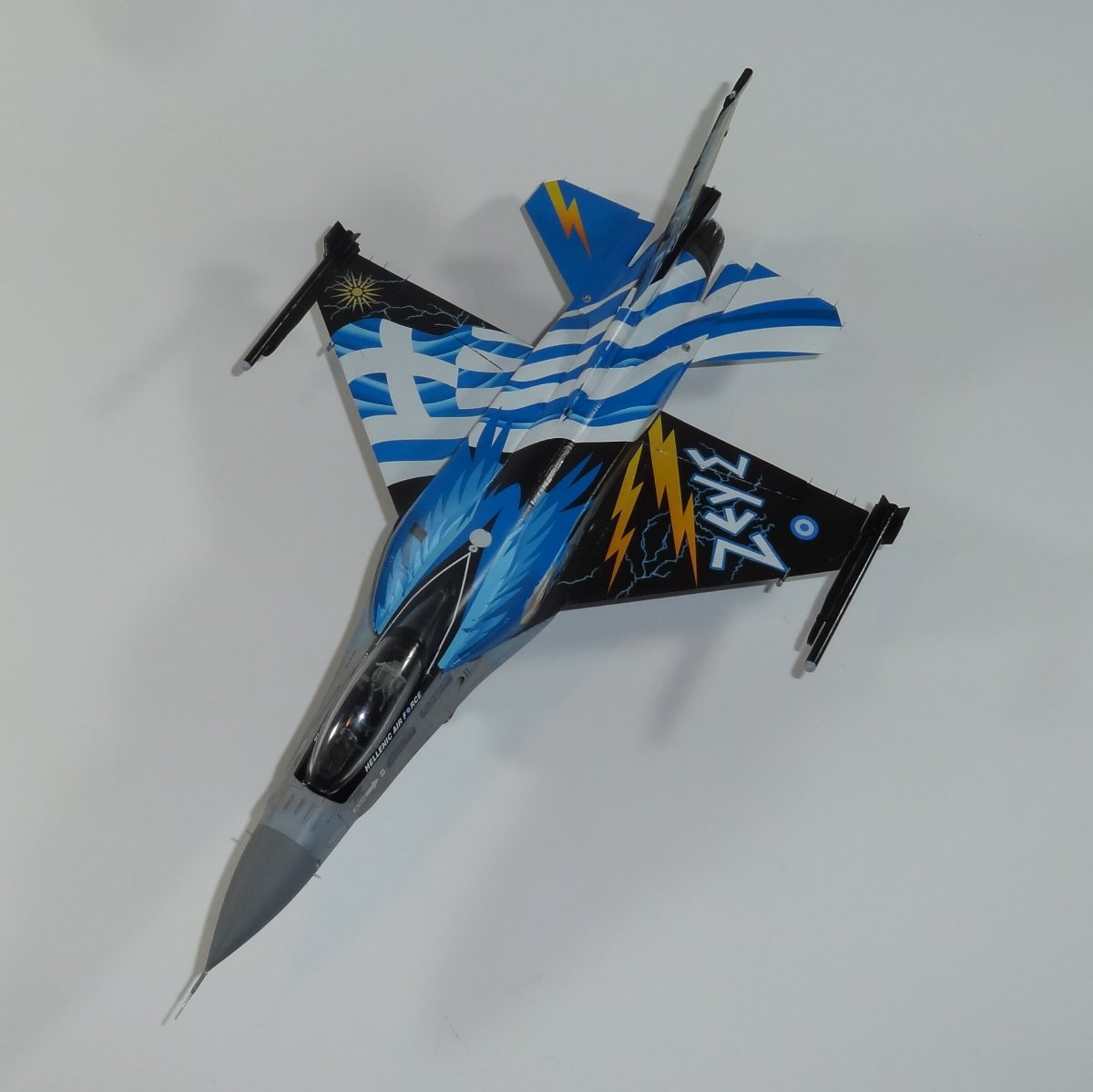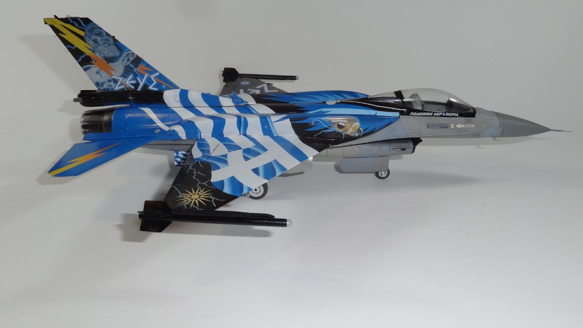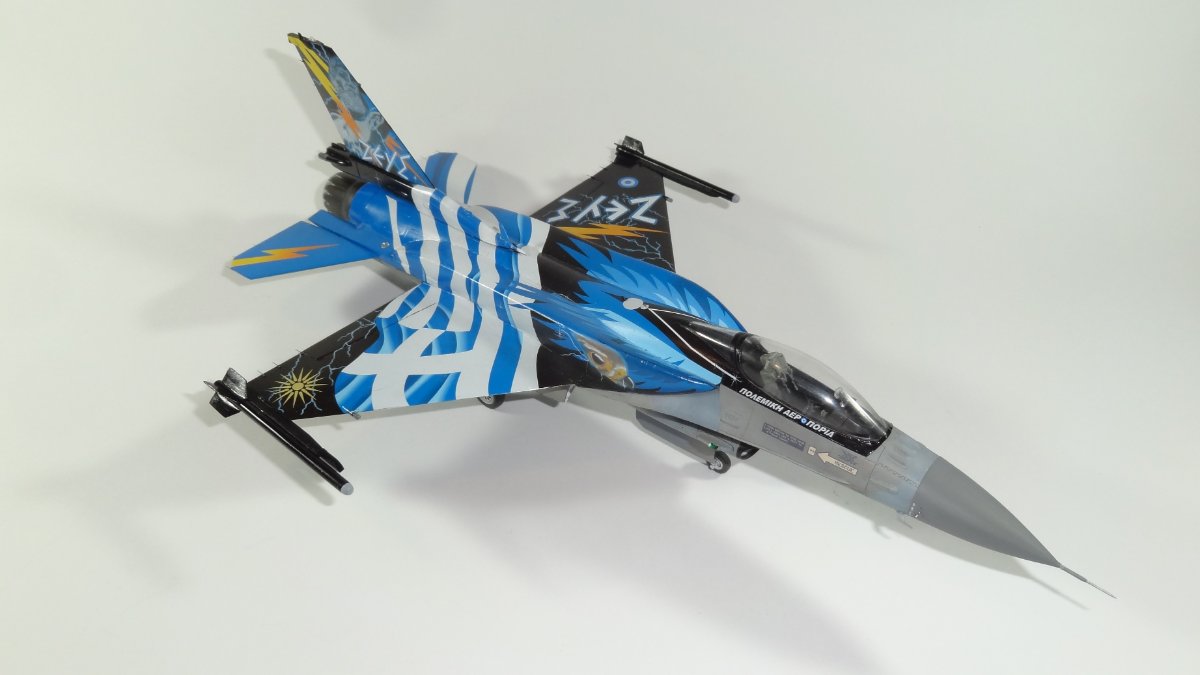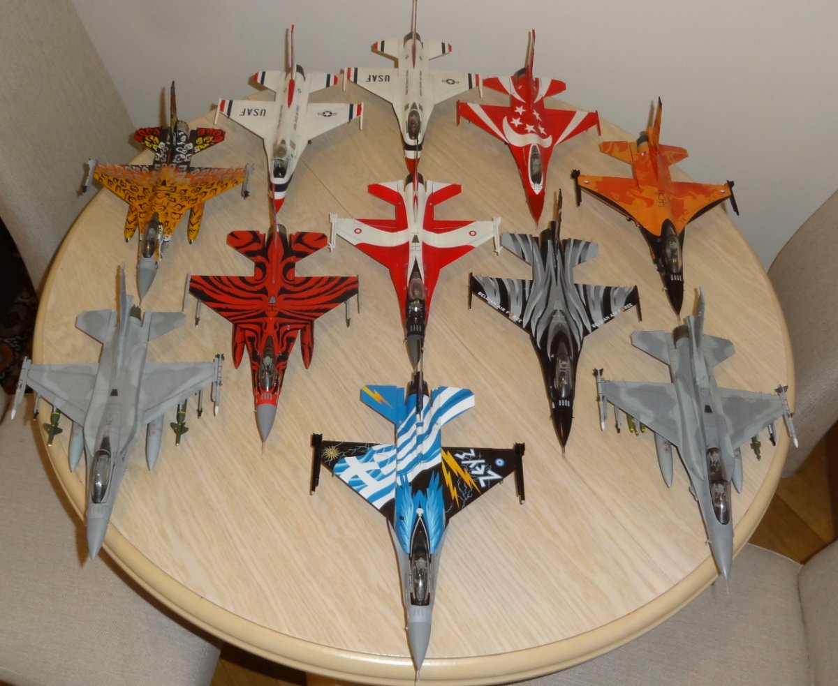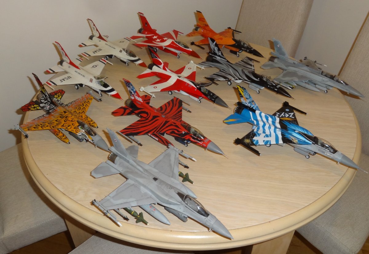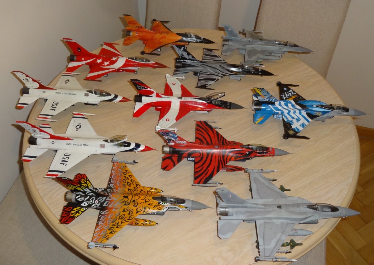 Sudus Napisano 12 godzin temu Share Napisano 12 godzin temu Dzień dobry I kolejny kolorowy F-16 ukończony. Model Tamiya. Wnęki podwozia i fotel pilota żywiczny. Kalkomamie Modelmaker. Sądząc że tak będzie łatwiej przykleiłem wpierw zbiorniki i dopiero później zacząłem nakładać kalkomanie. I to był błąd. Białe pasy się nie spasowały. Jest jeszcze kilka błędów które wprawne oko wypatrzy Kalkomania rewelacyjna położyła się idealnie. Ostatnie zdjęcia przedstawiają całą kolekcję na razie będzie na tyle Skala 1/48 Pozdrawiam Piotr 4 Cytuj Odnośnik do komentarza Udostępnij na innych stronach More sharing options...