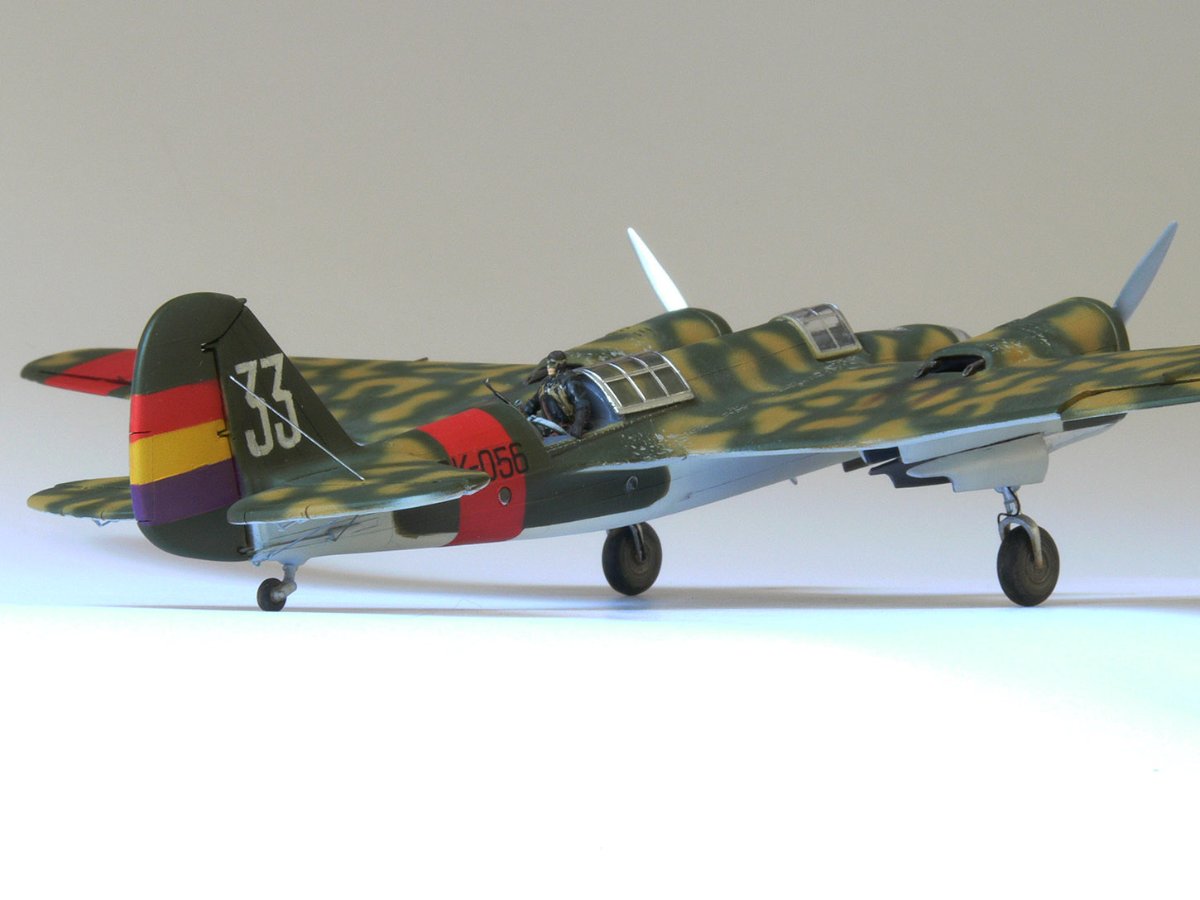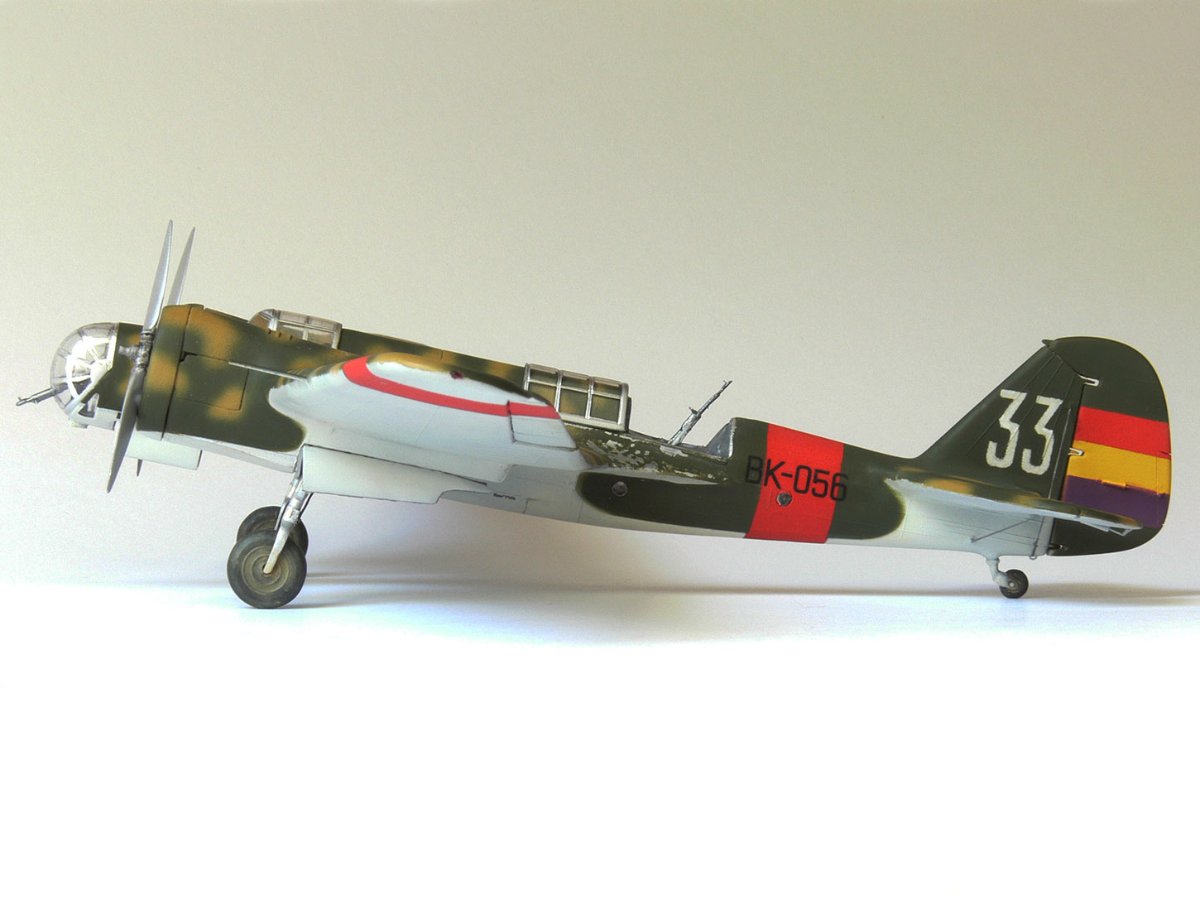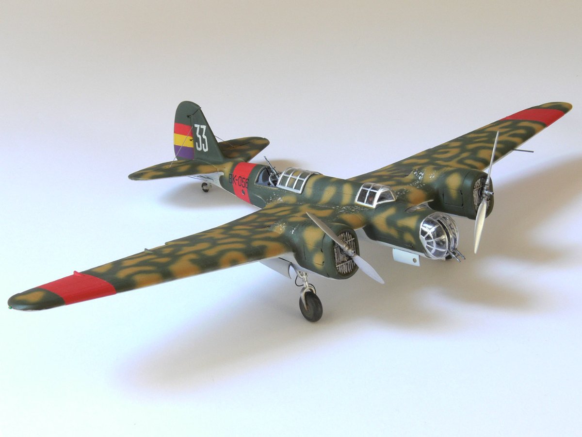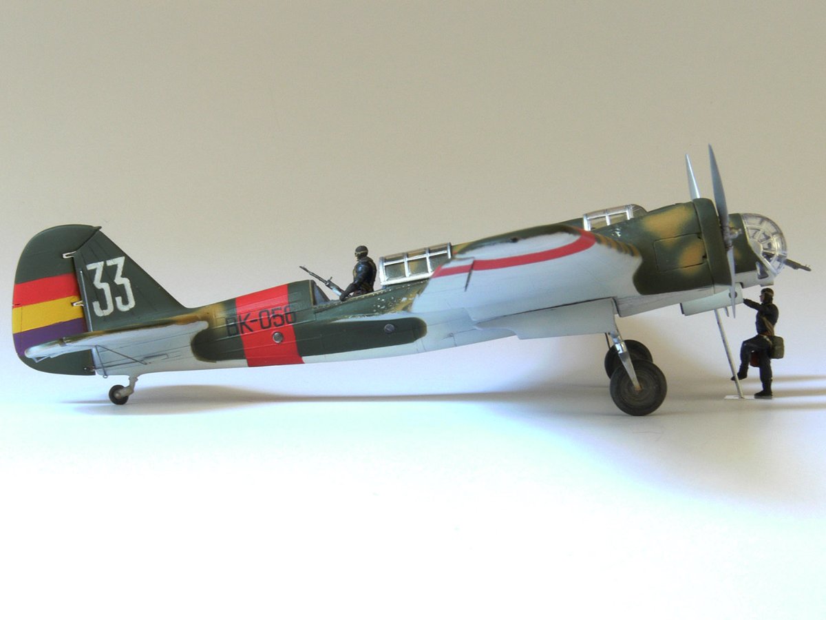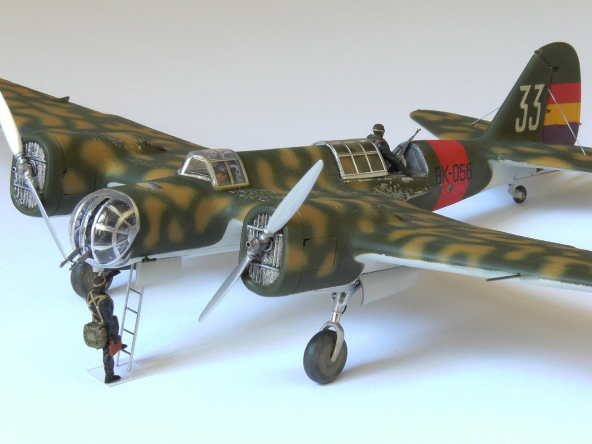 JollyMonk Napisano 7 godzin temu Share Napisano 7 godzin temu Wesołych Świąt wszystkim! Prezentuję model szybkiego bombowca Tupolew SB-2, należącego do Republikańskich Sił Powietrznych, z 1937 roku, z okresu hiszpańskiej wojny domowej. W moim modelarstwie preferuję tworzenie modeli typowych samolotów produkcyjnych, które odzwierciedlają ducha tamtych czasów. Zależało mi na pokazaniu samolotu w kamuflażu z napisem „BK” (Bombardero Katiushka) na boku, nawiązującym do nazwy nadanej mu przez Hiszpanów. Wybrany prototyp reprezentuje pierwszą połowę 1937 roku – ostatni egzemplarz samolotu bez hiszpańskich modyfikacji polowych. Zgodnie z moją tradycją, modele donieckiej fabryki składam „tak jak są”, bez istotnych modyfikacji. Innymi słowy, nie przerabiam linii podziału, nitowanie ani nie modyfikuję geometrii modelu: niech pozostanie on „pomnikiem” epoki. Dopuszczam drobne modyfikacje, które moim zdaniem ożywiają model. Przywiązuję większą wagę do malowania. W tym modelu zdecydowałem się umieścić oryginalnego pilota w kokpicie, otworzyłem kokpit nawigatora (z drobnymi modyfikacjami), wykonałem ster kierunku i drążki trymera, przewody podwozia, rurki Venturi i Pitota. Z aftermarketa użyłem owiewki Rob Taurus do Novo, masek Eduard do ICM, świateł lotniczych ELF, elastycznych nitkowych wsporników i kalkomanii z numerem kadłuba. Wszystkie pozostałe oznaczenia namalowałem za pomocą własnoręcznie wykonanych masek. Malowałem emaliami ARCUS (aluminium, piasek) i akrylowymi AK Real Colors (szaro-niebieskimi i ochronnymi). Odpryski zostały odwzorowane za pomocą Vallejo Chipping Medium. Należy zaznaczyć, że odpryski wykonałem nie na świeżej warstwie farby, ale po ukończeniu dwukolorowego kamuflażu. Zdjęcia przedstawiają kilka szczegółowych i powiększonych widoków, a także niektóre etapy budowy. Więcej szczegółów można znaleźć w opisie prac konstrukcyjnych na tym forum. Aby oddać klimat tamtych czasów, publikuję kilka pseudohistorycznych zdjęć. Po raz pierwszy do stworzenia tła użyłem sztucznej inteligencji, a nie Photoshopa. Dziękuję wszystkim, którzy wspierali mnie podczas budowy! 9 Cytuj Odnośnik do komentarza Udostępnij na innych stronach More sharing options...