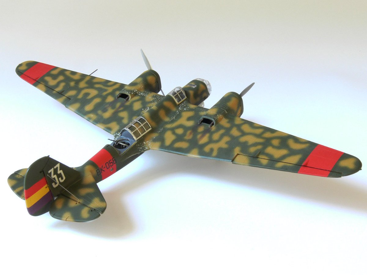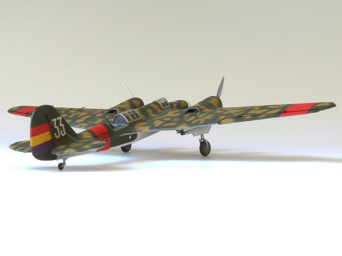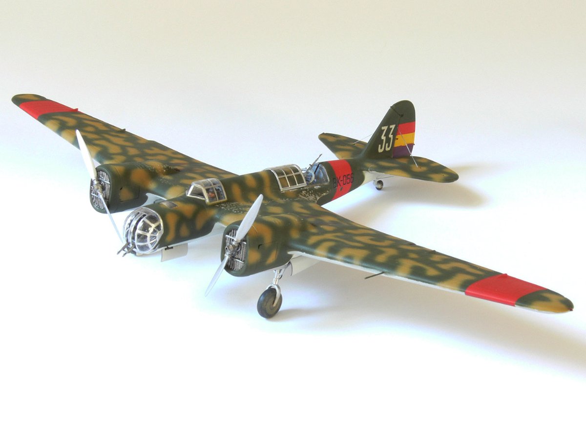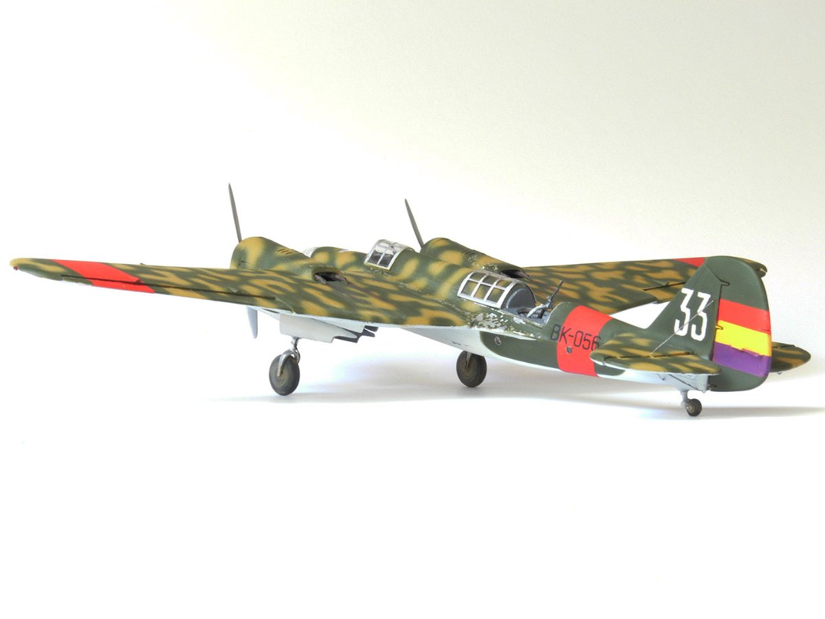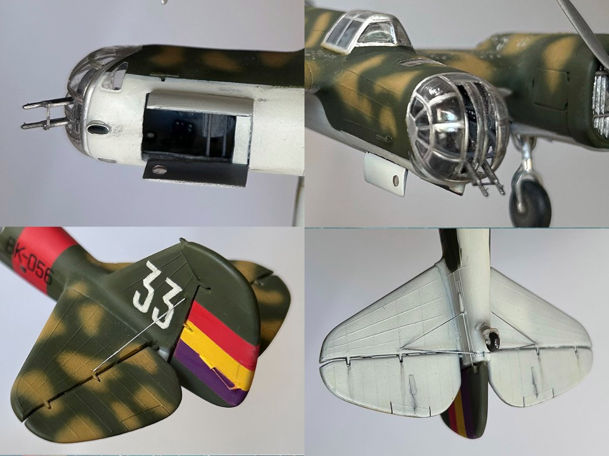 JollyMonk Napisano 7 godzin temu Share Napisano 7 godzin temu Wesołych Świąt wszystkim! Prezentuję model szybkiego bombowca Tupolew SB-2, należącego do Republikańskich Sił Powietrznych, z 1937 roku, z okresu hiszpańskiej wojny domowej. W moim modelarstwie preferuję tworzenie modeli typowych samolotów produkcyjnych, które odzwierciedlają ducha tamtych czasów. Zależało mi na pokazaniu samolotu w kamuflażu z napisem „BK” (Bombardero Katiushka) na boku, nawiązującym do nazwy nadanej mu przez Hiszpanów. Wybrany prototyp reprezentuje pierwszą połowę 1937 roku – ostatni egzemplarz samolotu bez hiszpańskich modyfikacji polowych. Zgodnie z moją tradycją, modele donieckiej fabryki składam „tak jak są”, bez istotnych modyfikacji. Innymi słowy, nie przerabiam linii podziału, nitowanie ani nie modyfikuję geometrii modelu: niech pozostanie on „pomnikiem” epoki. Dopuszczam drobne modyfikacje, które moim zdaniem ożywiają model. Przywiązuję większą wagę do malowania. W tym modelu zdecydowałem się umieścić oryginalnego pilota w kokpicie, otworzyłem kokpit nawigatora (z drobnymi modyfikacjami), wykonałem ster kierunku i drążki trymera, przewody podwozia, rurki Venturi i Pitota. Z aftermarketa użyłem owiewki Rob Taurus do Novo, masek Eduard do ICM, świateł lotniczych ELF, elastycznych nitkowych wsporników i kalkomanii z numerem kadłuba. Wszystkie pozostałe oznaczenia namalowałem za pomocą własnoręcznie wykonanych masek. Malowałem emaliami ARCUS (aluminium, piasek) i akrylowymi AK Real Colors (szaro-niebieskimi i ochronnymi). Odpryski zostały odwzorowane za pomocą Vallejo Chipping Medium. Należy zaznaczyć, że odpryski wykonałem nie na świeżej warstwie farby, ale po ukończeniu dwukolorowego kamuflażu. Zdjęcia przedstawiają kilka szczegółowych i powiększonych widoków, a także niektóre etapy budowy. Więcej szczegółów można znaleźć w opisie prac konstrukcyjnych na tym forum. Aby oddać klimat tamtych czasów, publikuję kilka pseudohistorycznych zdjęć. Po raz pierwszy do stworzenia tła użyłem sztucznej inteligencji, a nie Photoshopa. Dziękuję wszystkim, którzy wspierali mnie podczas budowy! 9 Cytuj Odnośnik do komentarza Udostępnij na innych stronach More sharing options...