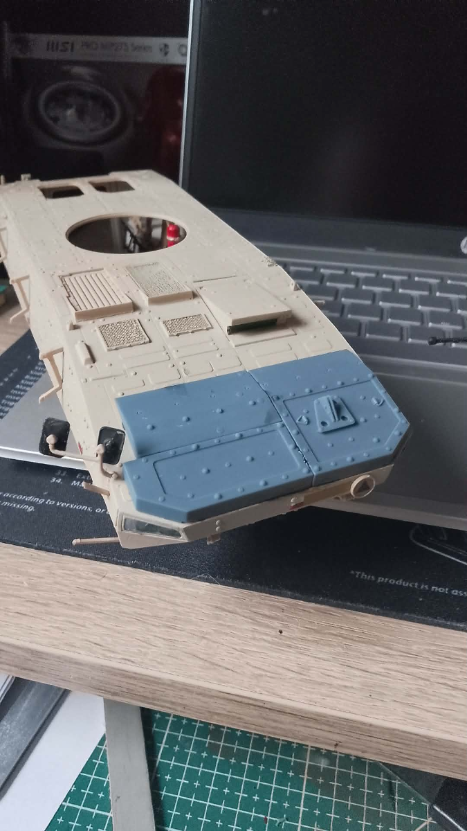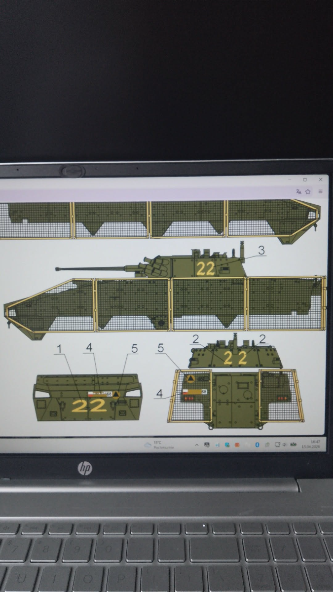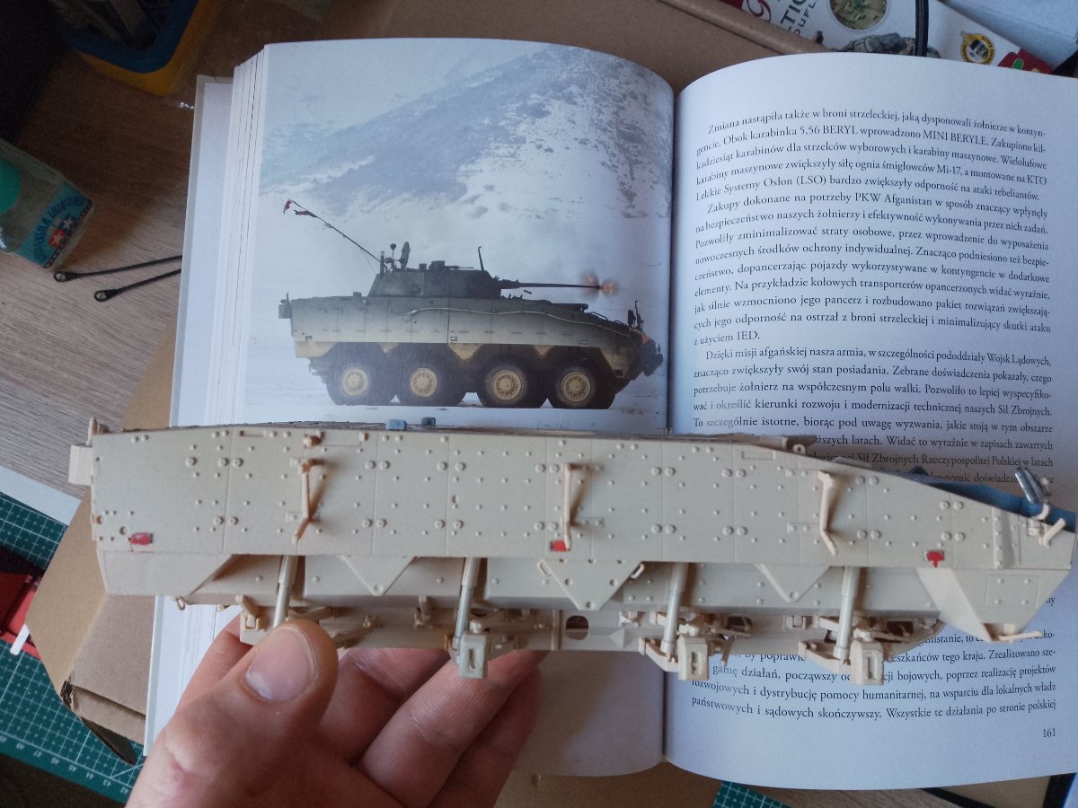 Hej. Tak wyszło iż stałem się posiadaczem "używanego rosomaka od ibg" w wersji afgan. Ktoś skleił,jakoś byle jak pomalował i niestety połamał.  Znalazłem w domu kalki od szanownego Tomka z firmy Toro Model. Akurat mi pasuje rosiek i numerze bocznym 22. Po przeanalizowaniu materiałów których jest mało... Gdyż twardogłowi w monie wymyślili wyczyścić internet ze zdjęć PKW Afganistan. Bazuje na tym co jest i trochę domysłach. Na przód dodałem żydowski pancerz Rafaela. W sumie też ma być na bokach ale będą siatki na równi i ledwo będzie go widać. Odpuszczam gdyż doktoratu z tego modelu nie będę robił i liczył każdego nita.